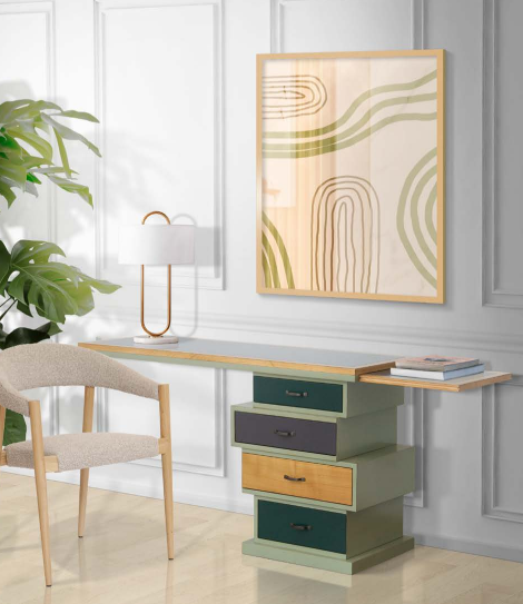 Les bibliothèques, bureaux design, consoles, tables basses … sont pensés comme des meubles structurés et inspirants, où l’esthétique rencontre la fonctionnalité.