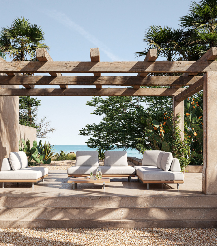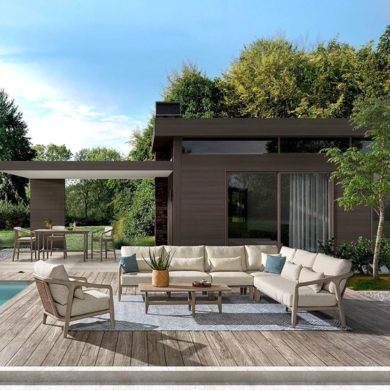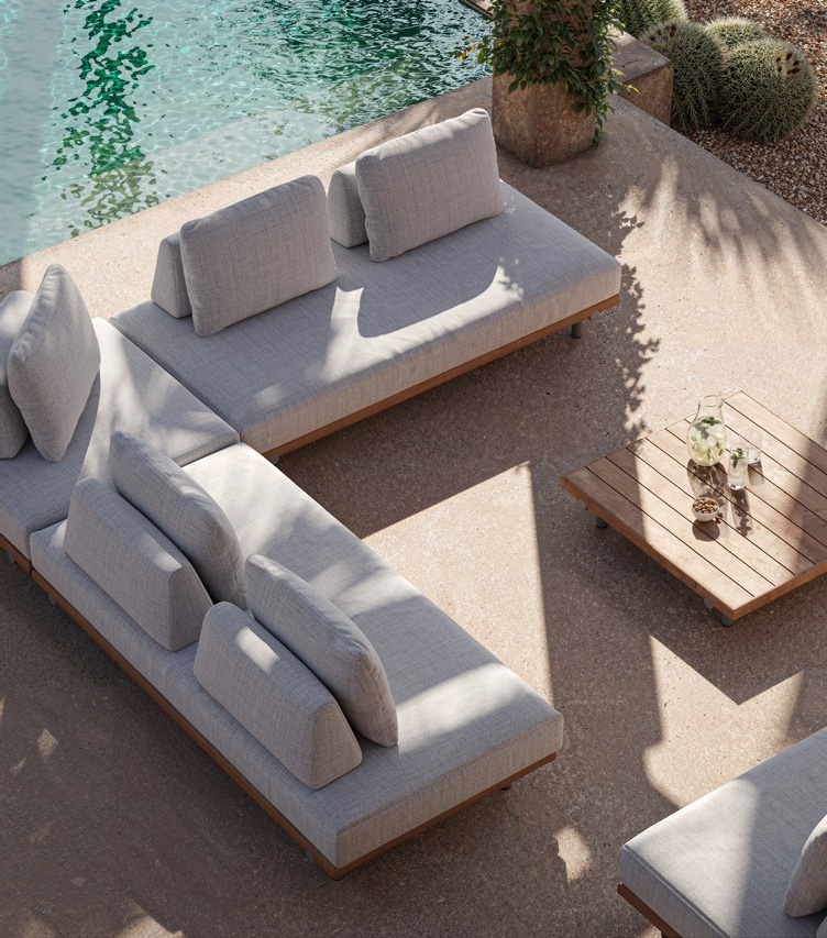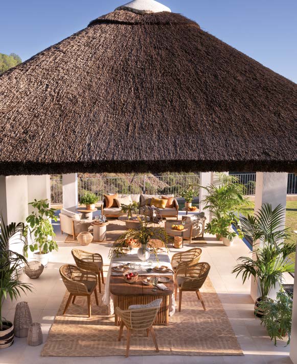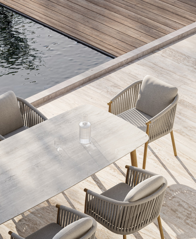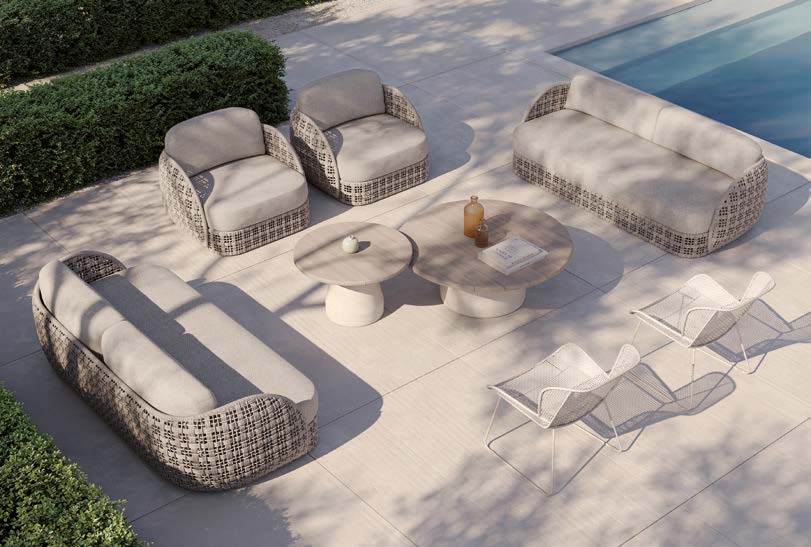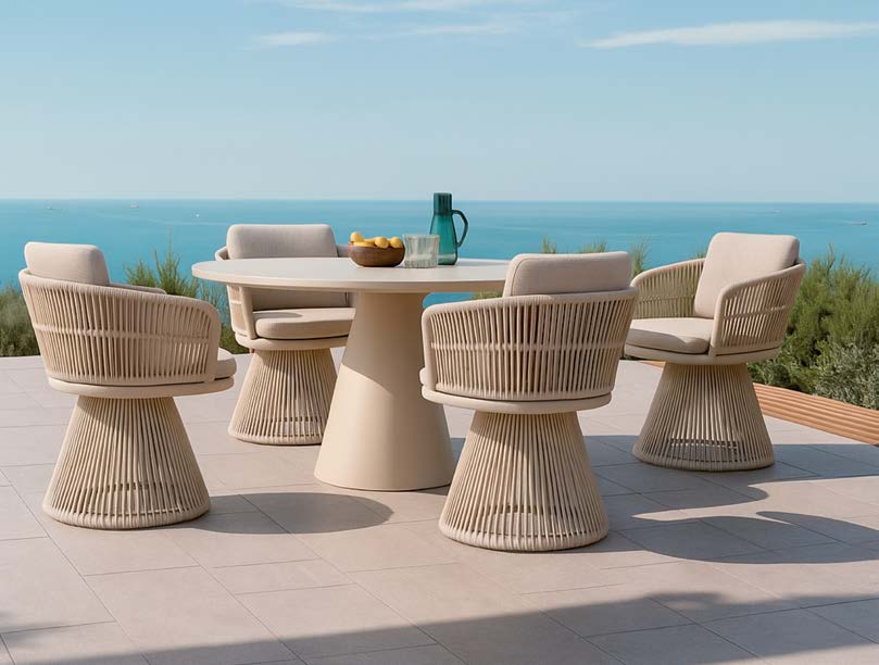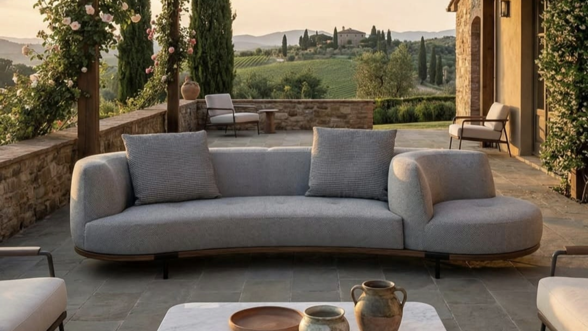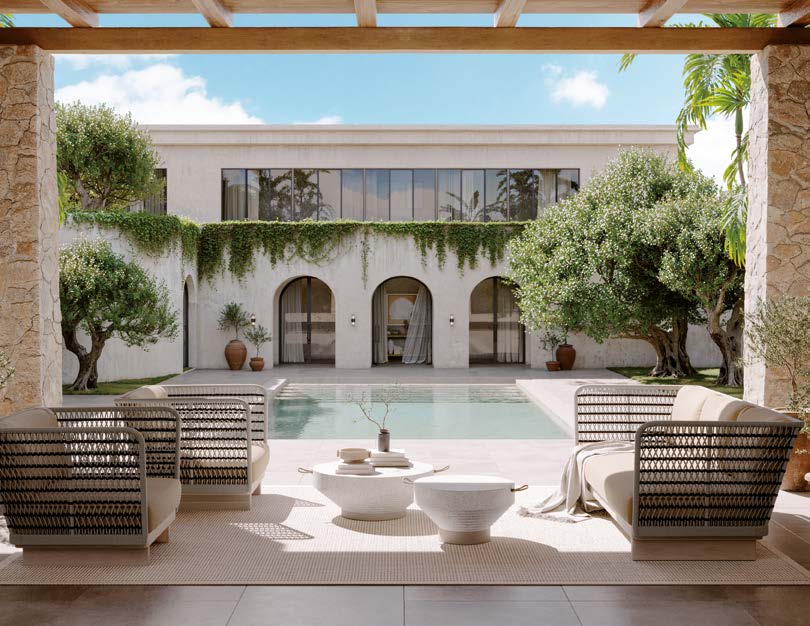 À l’extérieur, terrasses, patios et jardins deviennent de véritables salons à ciel ouvert. Le mobilier y est pensé pour résister au temps tout en conservant une allure sophistiquée.